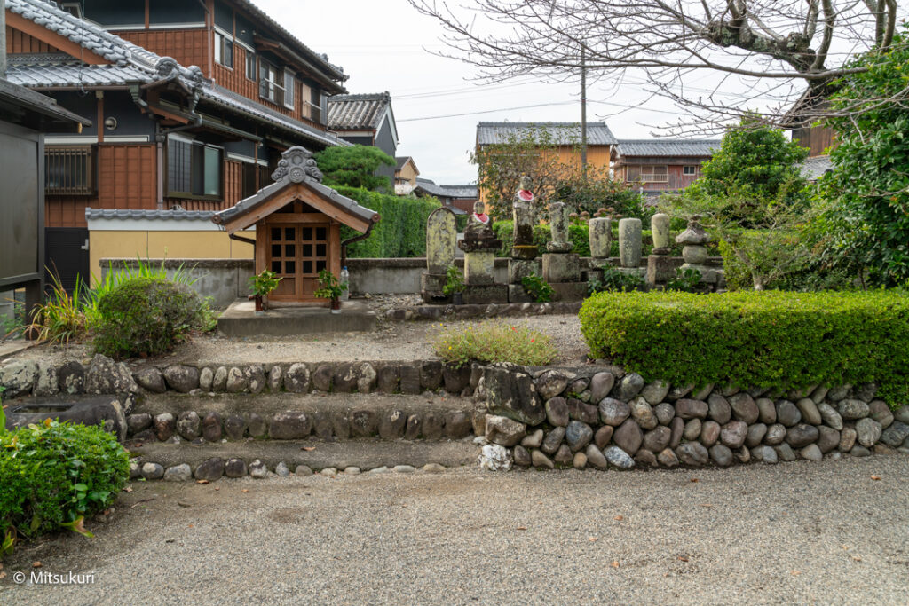 右手の竿柱のさらに右側に立っている石塔は大乗妙典塔 昭和56年に道路拡張に伴い 塔を移転した際に白い小石に一字ずつ経文を書いた多くの経石が出たそうです 天保の飢饉の際に六部の行脚僧が築いた一字一石塔です 玉城町には上田辺に 正念僧即身仏供養碑塚 というのもあります 行き倒れそうになったやはり六部の僧が 助けてくれた村人のために人柱になったという言い伝えです