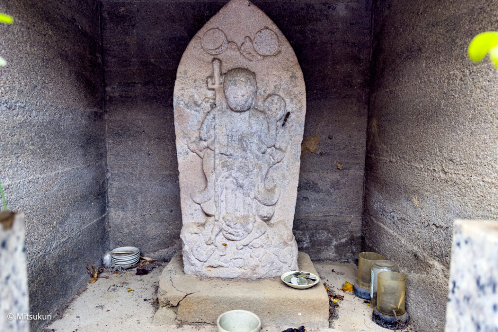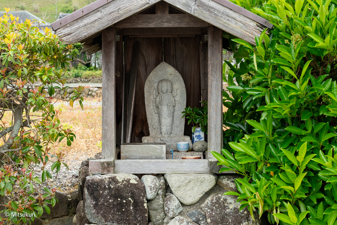 集落を東西に横切っている在所道の中ほど 基壇を設けた上にコンクリート製の庚申祠が建っています ここは集落の外れというわけでもなく どうしてこんな場所に?と気になって 少し古い地図を開けて調べてみました 昭和の中頃まで この祠のある場所の北側にはお寺があったようで 当時は このあたりが集落の西の端にあたっていたようです