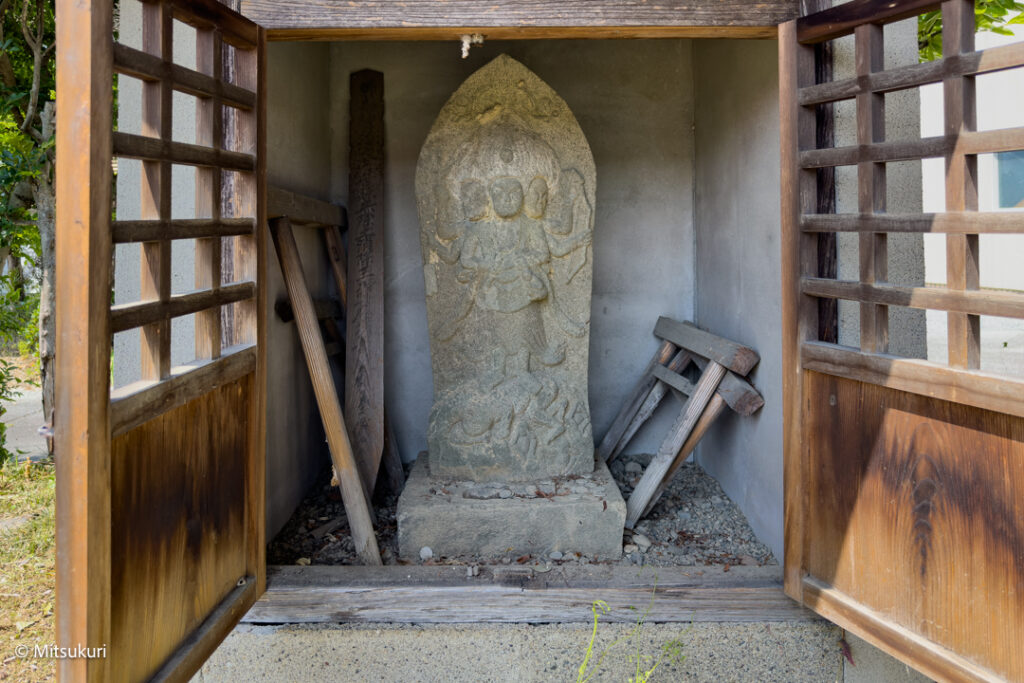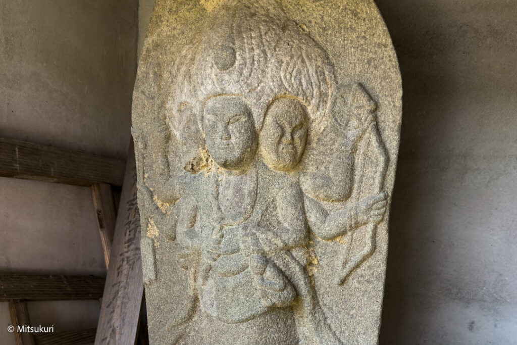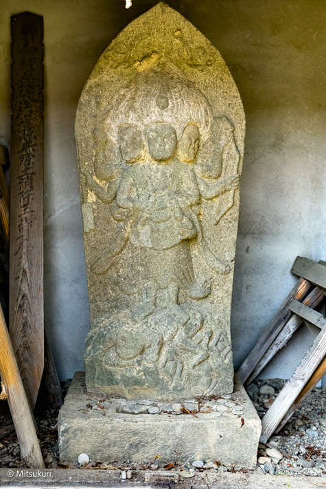 境内に並んだ小さなお堂のひとつが 庚申堂で 失礼して扉を開けさせていただくと 白い花崗岩に刻まれた青面金剛が立っています