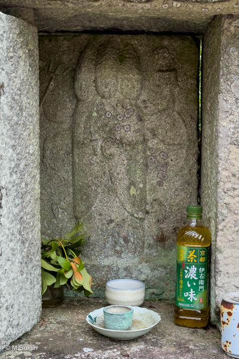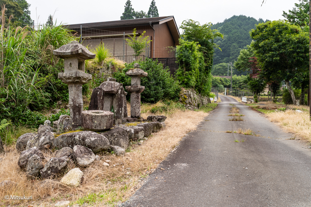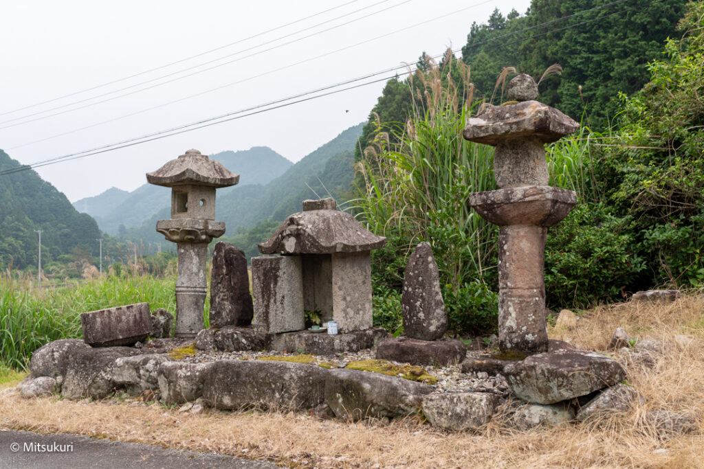 東垣内の青面金剛 松阪市嬉野小原町 松阪市 X Facebook はてブ Pocket LINE コピー 2025.12.252025.12.26 小原橋から南に50メートルほど歩くと 道端に石灯籠や石碑が集められた場所があります 中央に庚申祠 そして二基の石灯籠と 二基の石塔です石灯籠は旧小原神社が廃社の際にここに運ばれたといいますそして左の石塔は大日碑 右は「南無地蔵菩薩」とあって地蔵碑です地蔵碑は近くにあった風呂講にまつわるものとのことです 庚申さんは かなり摩耗していますが 三面六臂の青面金剛像です ずんどうの形の身体に細い腕が薄肉彫りされています右手に剣 三叉戟 箭左手に 索? 宝輪 弓 でしょうか