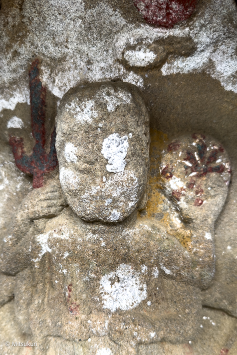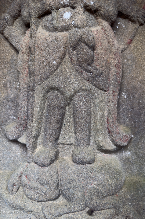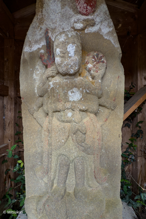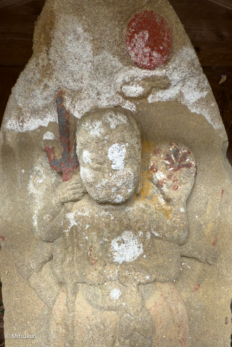 日輪と上衣と持物の一部に朱の彩色が残っています