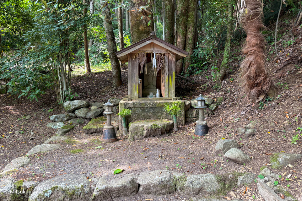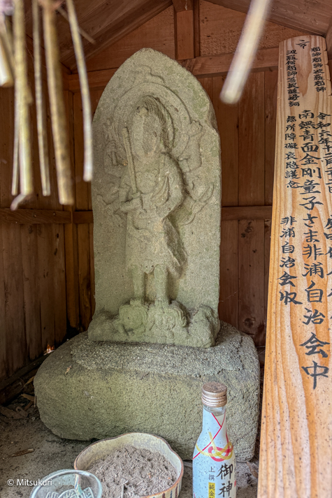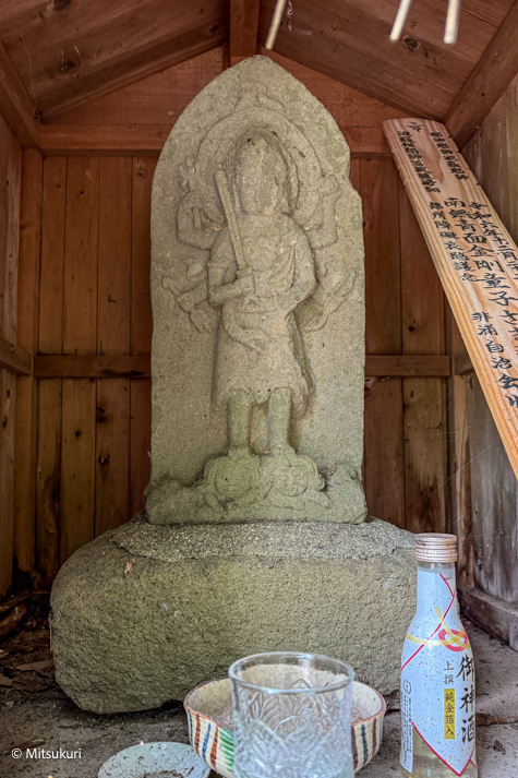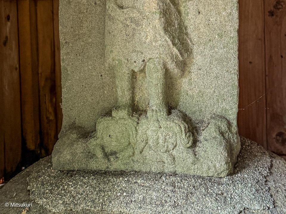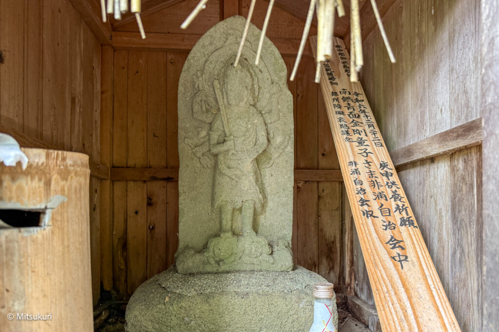 非浦庚申 津市美杉町川上 津市 X Facebook はてブ Pocket LINE コピー 2025.12.27 奥津から雲出川に沿って県道奥津飯高線を遡ってきましたが奥津から4.5キロほど走ったところで 雲出川は左右に分岐して坂本川と名前を替えます左に進めば川上さん 右に進めば いよいよ学能堂山の南麓です分岐を右にとって しばらくいくと 右手に小さな庚申堂をみつけました 一面六臂の青面金剛です 光背に日月はなく 頭光輪があります右手には 肩に担ぐような長剣 三叉戟 箭左手は法輪 弓 真手は右手の長剣の柄にあてがっているようです 猿鶏はいないですね邪鬼が二匹いるみたいです